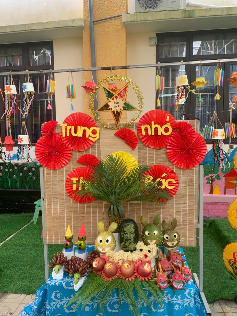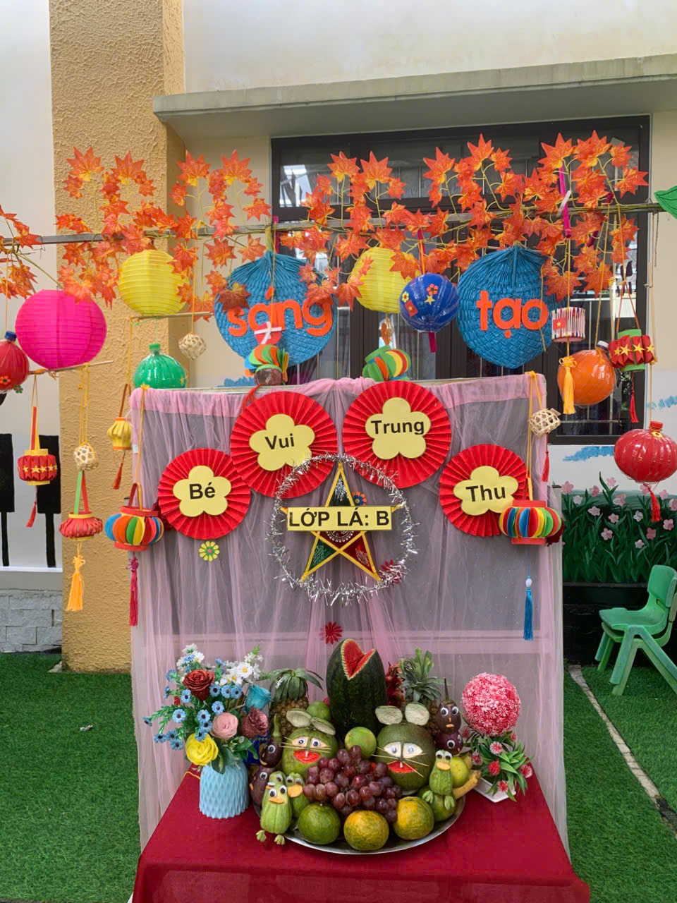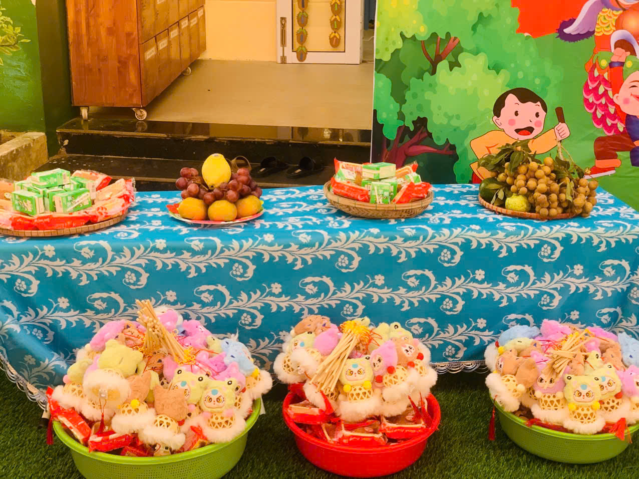 Các lớp cùng nhau thi trưng bày mâm cỗ Trung thu đẹp mắt, sáng tạo và đầy ý nghĩa. trưng bày sản phẩm tự các con làm; trưng bày mâm ngũ quả thành các gian hàng như Chồi A, Chồi B, Lá A, Lá B, mầm , nhà trẻ A, nhà trẻ B đều được trang trí rực rỡ, sinh động với chủ đề Vui hội trăng rằm -Trung thu nhớ Bác.