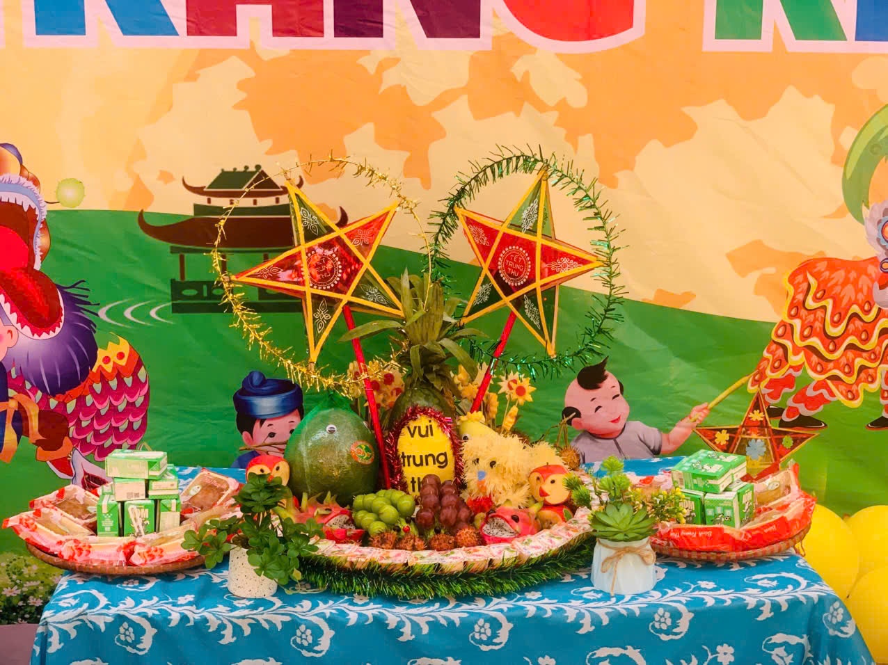Mỗi mâm cỗ đều có bánh trung thu, sữa, lồng đèn, trái cây, mặt nạ, thể hiện sự khéo léo và tinh thần đoàn kết của cô và trò nhà trường.
